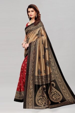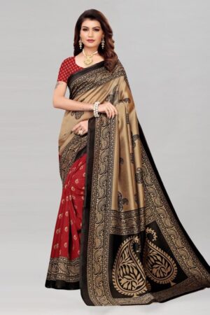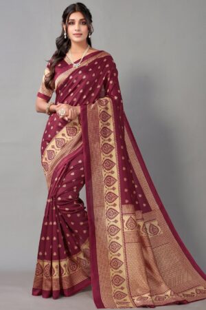 Beige And Maroon Coloured Poly Silk Printed Saree