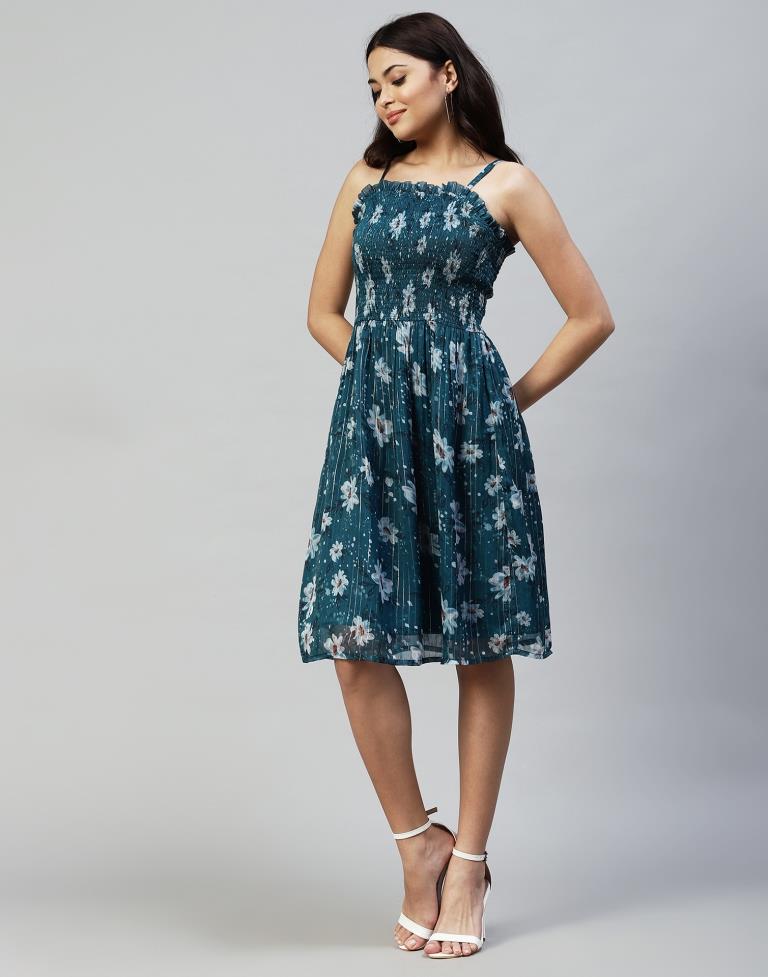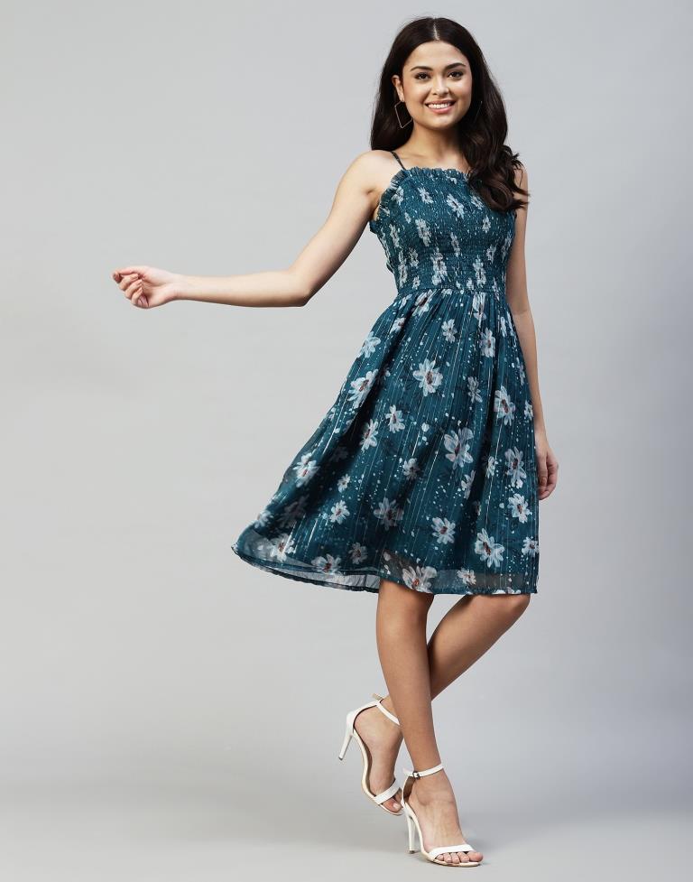 Teal Embroidery Cotton Flared Dress